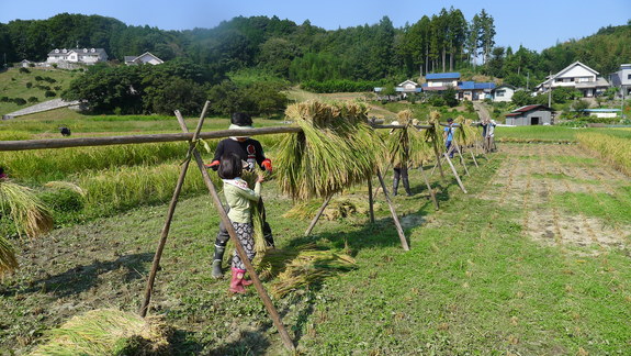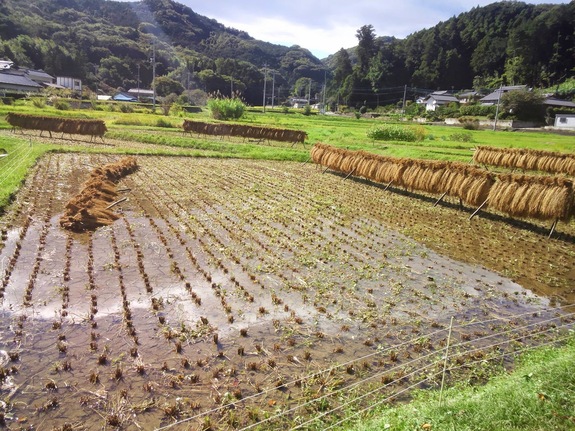 9月、稲穂は徐々に頭を垂れ始め、次第に黄色く色づいてきて、下旬には、予定通り稲刈りをすることができました。刈り取った稲ははざ棒に掛けて天日干し。最後の最後で二つの台風が立て続けにやってきたり、いのししが出没して、対応に追われましたが、大きな被害は無く、無事に脱穀をすませることができました。