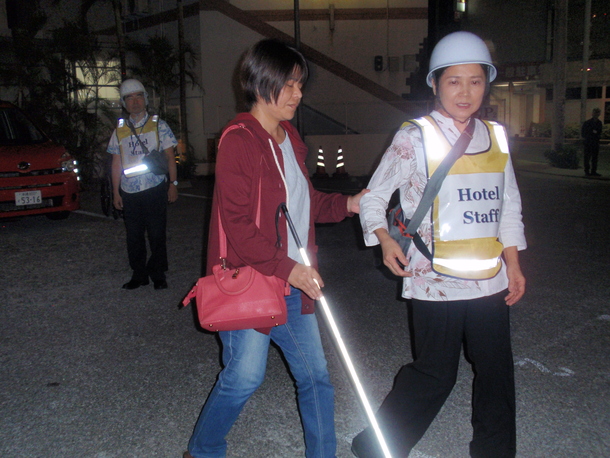 当法人では、平成18年よりこの取組を開始し、観光バリアフリーを進める一方で、決して忘れてはならない目線として、講習会や講演会などで折りにふれて啓発に努めてきました。平成23年の東日本大震災を契機に、平成25年には、沖縄県の事業の一環として今回のマニュアルの元となる「逃げるバリアフリーマニュアル」を編集しました。平成28年には2度にわたり、ホテルで実証実験(避難訓練)を行いました。そして、平成30年には公益財団法人 木口福祉財団の「平成29年度地域福祉振興助成」を受けて「逃げるバリアフリーマニュアルの改訂版」を発行し、同年11月には、沖縄県社会福祉振興基金の助成を受けて、那覇市内のホテルで夜間の実証実験を行いました。そして、今年は、2019年ECOMO交通バリアフリー研究・活動助成を受けて、災害時バス車内における障がい者・高齢者の避難対応に関する実証実験を実施します。福岡でも、こうした取り組みを広げて行きたいと考えています。
