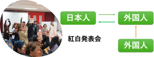 直近では外国人が、外国人に対して日本語だったり自分の国の文化を伝えたりしています。2019年3月に開催した紅白発表会では、「日本人」だけでなく、外国人も同じ1票として各部門別(衣装部門・料理部門・音楽朗読等部門)の審査員となり、全員で採点し、点数の高いメンバーには賞状や賞品をおくりました。