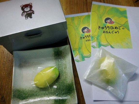 また、絵本の完成を記念して、真室川のお菓子の名店「おかしの平和堂」さんのご協力で『きゅうりひめごまんじゅう(仮)』を試作中です。まだ詳しいことは決まっていないのですが、今日届いたものは、きゅうりひめごに出てくる真室川の伝承野菜"勘次郎胡瓜"のような形をしていてとっても可愛らしいお饅頭でした。食べてみると、皮がもっちりしていて(米粉を使用しているそうです)餡は白あんで、全体的に甘さ控えめのおいしいお饅頭でした。