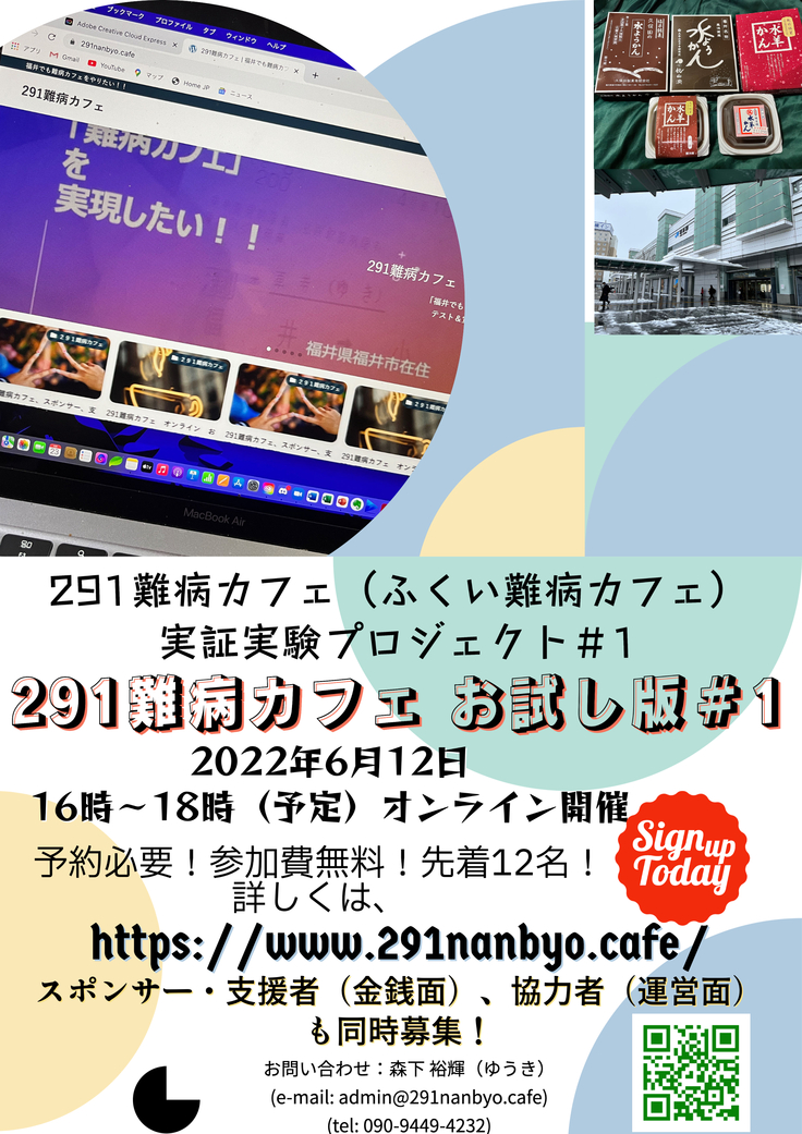 なお、先日「291難病カフェ(ふくい難病カフェ) お試し版!いっかいめ!」(2022年6月22日開催)をオンライン限定で(費用は森下裕輝の自腹で(涙))開催しましたところ、多くの全国の地域から参加頂き、ご意見として出てきたのが、「若い人と話せる場がない」「病気のことについて話せる場がない」などの声を頂きましたので、ぜひ本クラウドファンディングを成功させて、継続して「291難病カフェ(ふくい難病カフェ)」を実施したいと思っているところです。