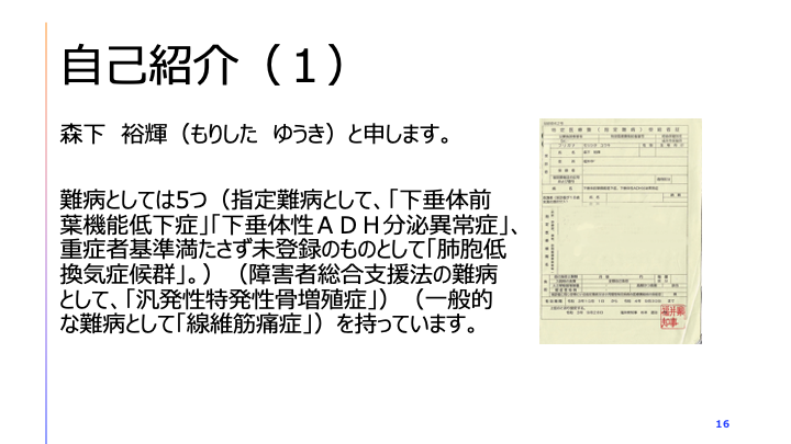 あらためまして、森下裕輝と申します。京都府(京都市)で生まれ、大阪府(枚方市)で育ち、大学は石川県(金沢市)の大学で法学を学び、そして現在は福井県(福井市)に住んでいるという、あちこちにいた経験がある人です。また、今回の重要なカギになるのですが、難病(国の指定難病、と呼ばれる、国の難病を含めて)を5つ抱えています。でも、難病があっても行動的で、全国あちこち飛び回っており、モットーは「とにかく明るく行動的な難病患者」、です。