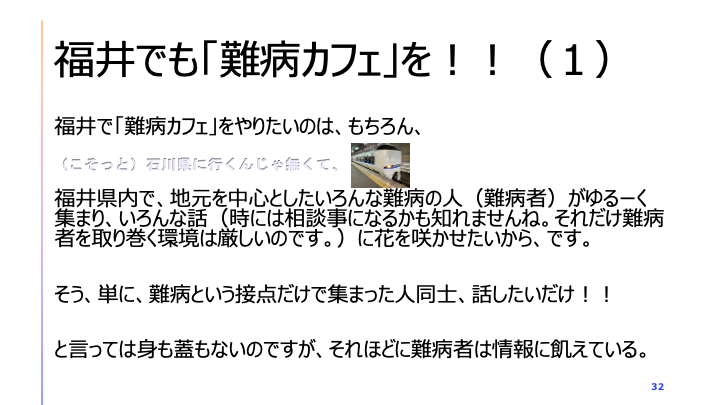 その私が、今回、福井県で「難病カフェ」(定期・不定期開催で、常設ではない(開催時に会場を借りて行うものです、常設店舗ではありません)、難病者(特に若い難病者、難病は指定未指定を問わない)、カフェと付くけど、実際には闘病生活の中で出てきた話したいことを話したり、時には相談になったり、愚痴をこぼしたり、でもそうやって闘病生活の充実や闘病意欲の向上を図る場所)を作ろうと思っています。福井県には残念ながらそういう場がないようですので。