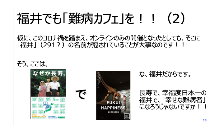 この難病カフェを福井県で開くことで、幸福度日本一の福井から情報を発信して、「291(ふくい)難病カフェ」の参加者みんなが幸福になることを目指し、また、福井県内で孤独な戦いを、孤独な闘病生活を送ってきた難病者に、一人じゃないことを伝え、また気軽に話したり相談したりすることで闘病意欲を高めるとともに、オンラインで全国から参加してくださった方とも交流や相談の共有などを行い、相乗効果で、参加者みんなで「FUKUI HAPPINESS」になろうじゃないですかと。