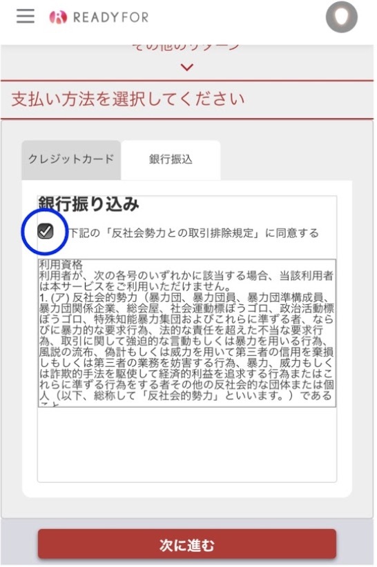支払い方法で「銀行振込で支援する」を選択し、[次へ進む]をクリック