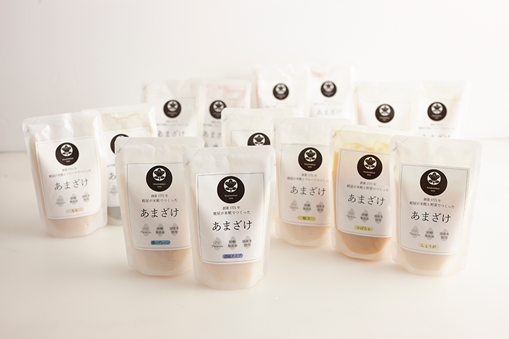 国産米100%使用、砂糖をいれずに手づくり米こうじの甘みを活かしてつくった無添加濃縮タイプのプレーンのあまざけに、もも・いちご・ブルーベリー・りんご・かぼちゃ・柚子など12種類のフレーバーがあります。