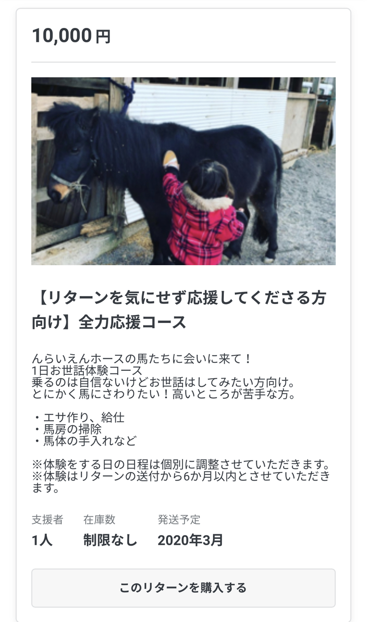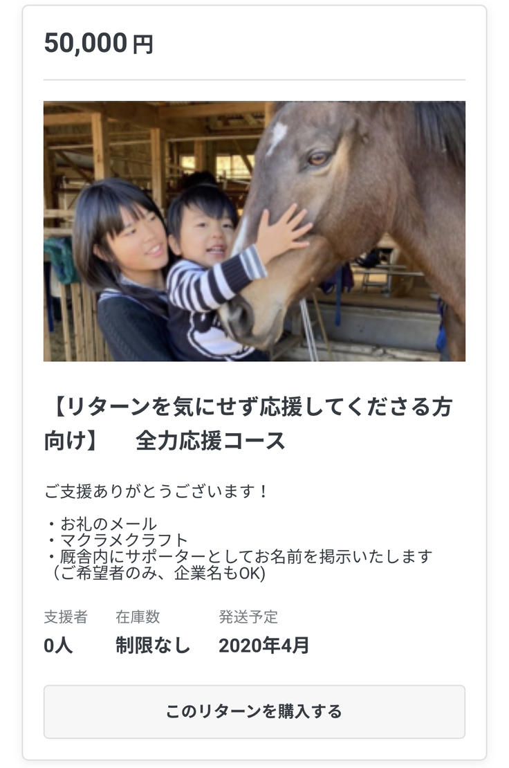 更に残り10日となり大口の支援もしやすいのでは?と厩舎内にお名前を掲示させて頂きます!高額ですがリターンをご用意しました。