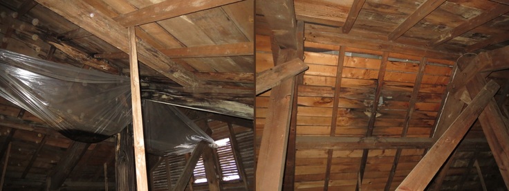 屋根裏の状況②:仮の支えやビニールシートによる応急措置も限界です