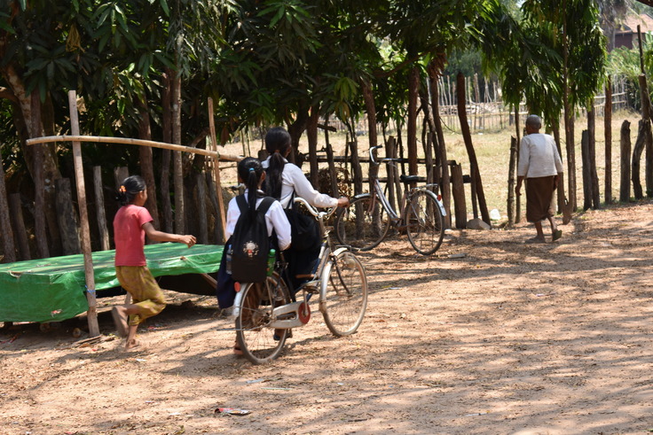 これは、子どもたちの通学の様子です。多くの子どもたちが自転車に乗って学校にやってきます。二人乗りなんて当たり前です。中古の自転車に乗っている子も多く、日本人の名前が書かれた自転車を使っている子も見かけました。