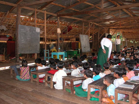 ミャンマーの公立小学校では、民政化になった政府によって義務教育を取り入れていて、取り敢えず授業料は無料になりました。しかし制服や学用品、施設修繕費、補習授業料、交通費などの費用負担が大きいのが現状です。