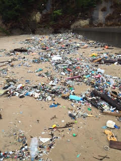 ゴミを拾っても拾っても海が荒れるとゴミが流れ着く片野海岸。