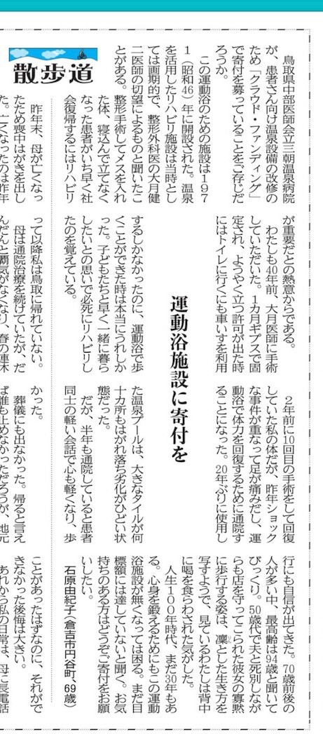 本日1/19の日本海新聞16面「散歩道」にクラウドファンディングの投書がありました。