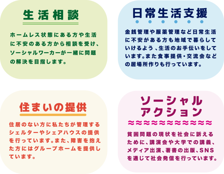 埼玉県さいたま市を中心に生活困窮状態にある方の支援を行っているNPO法人です。路上巡回活動やシェルター、グループホームを通じた住まいの支援、支援活動の社会への発信(ソーシャルアクション)を行っています。