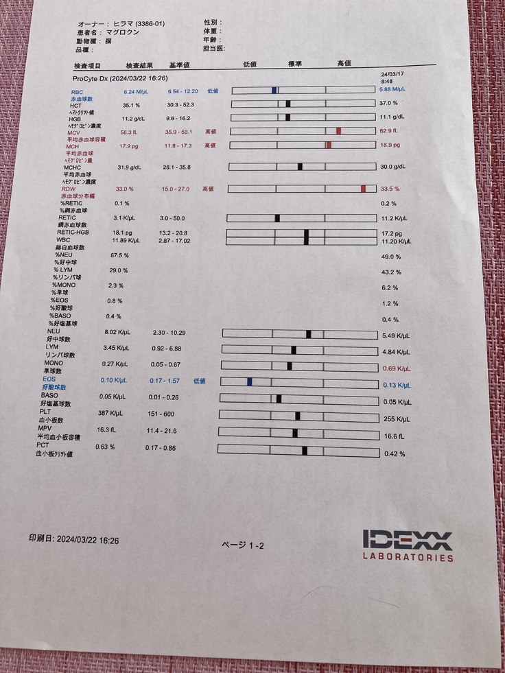 3月22日に受診いたしました。血液検査の結果、HCTの値は35.1%と標準値をなんとかキープしておりました。