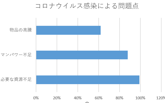 コロナウイルス感染による問題点では、99%が必要な資源不足を懸念しております。