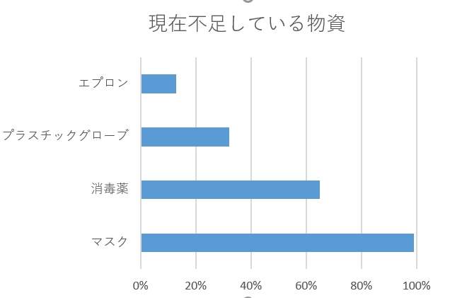 どのような資源が足りていないか調査したところ、マスクや消毒薬が多いことがわかります。