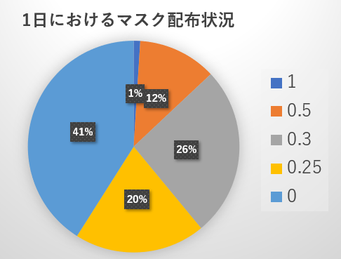 マスクについて現在の状況を調査したところ、99%以上の方がサージカルマスクを1日1枚配給されていないことがわかりました。半数以上は事業所からほとんど配布されずに自己にて用意するしかない状況となっています。