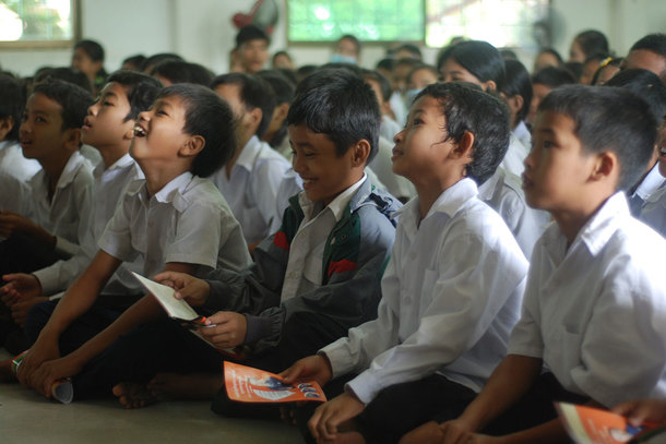 カンボジアの子どもたちにとっては初めての落語でしたが、子どもたちは目を輝かせ、素敵な笑顔を見せてくれました。高座の横には、英語とクメール語の字幕を写し、師匠の話すスピードにあわせて、字幕を進めながら、子どもたちも一生懸命師匠と字幕を交互に見ながら楽しみました。