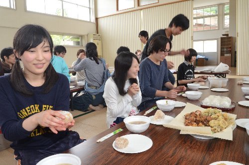 山菜の天ぷら、手づくりコンニャクのお味噌汁、タケノコの炊き込みご飯のお結び。もちろん、お米は仁多米!