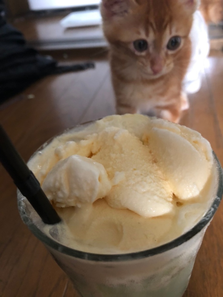 先住猫みぃちゃんはアイスをひとなめするので置くと