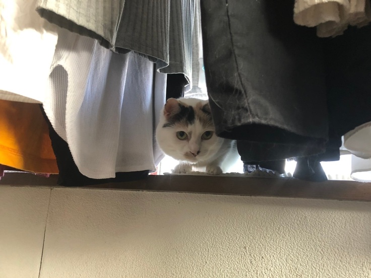 みぃちゃんは ちっこい毛玉が怖くて降りてこれません
