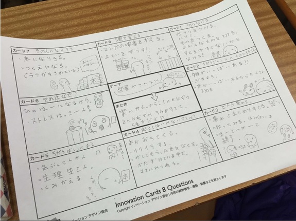 私たちは、現在、ハワイ大学の教授であったクリフォード・H・クラーク先生や鹿児島大学の先生方の協力を得ながら、授業を進めています。「イノベーションカード」は、カードに書かれた質問に答えることで、自分の思考の枠から出られるツールで、7つの思考ステップに沿って56の質問が取り揃えられています。ランダムに、あるいはひとつの流れに沿って選んだカードの質問に答えるうちに、アイデアや解決のヒントに出会うことを可能にします。また「8クエスチョンズ」は、誰でもがこのカードから問題解決のヒントを得られるようにと創られたシートです。小学生でも使えるのでこれらは決して難しいものではありません。