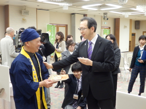 喜多方もっちり餃子は福島県が主催するふくしまおいしい大賞優秀賞受賞し、H27年3月17日 福島市の杉妻会館で表彰式が開催されました。その時、内堀県知事に喜多方もっちり餃子を食べてもらいました。