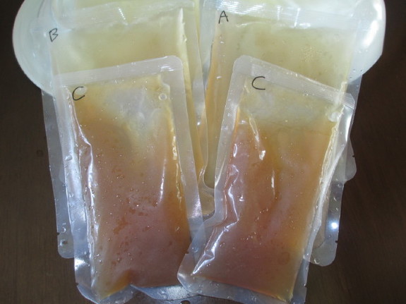 山際シェフに三種類のスープを作っていただきました。前回は和風になってしまいましたので今回は中華風を表現したいとの要望をいたしました。A.・Bはストレートです。手前のCは三倍濃縮です。まだ、試飲はしていませんので何とも言えませんが完成にはもう少し時間がかかります。念のためにもう一社サンプルを取っています。