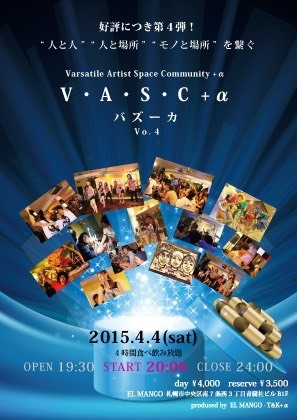 イベント名V・A・S・C+aの由来は V Versatile 多種・多様な A Artist アーティスト S Space 空間 C Community 集結した +a プラスアルファー 「多種・多様なアーティストが一つの空間に集結する事で新しい何かが生まれる」というものです。