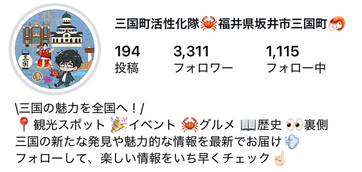\三国の魅力を全国へ!/ 📍観光スポット 🎉イベント 🦀グルメ 📖歴史 👀裏側 三国の新たな発見や魅力的な情報を最新でお届け💨