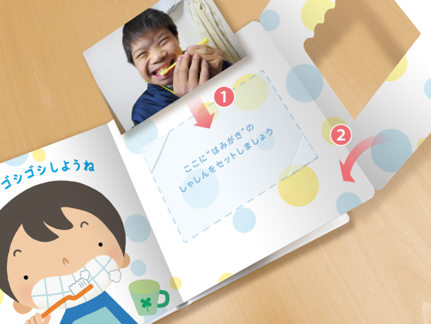 一般的に障がいを抱える子どもたちには、次に自分がとる行動を絵カードを利用して理解してもらいます。そこで今回私が考えたのは、絵本の中に実際に自分の写真を埋め込むことができる仕掛けがある「アルバム絵本」です。