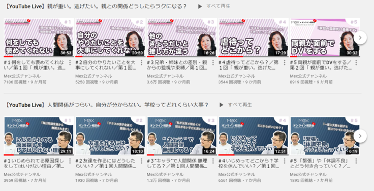 また、相談機関では対応が難しい部分や、相談機関を増やしている間に、Mexの独自の取り組みとして、ツイキャスやYoutubeで、オンライン相談会・対談を実施いたしました。