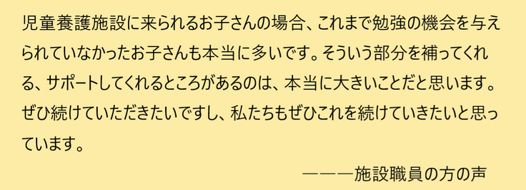 毎日子どもたちの学習をサポートする施設職員さんからも、3keysの教材や学習支援に期待の声をいただいています。