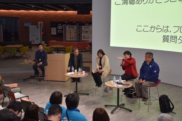 午後には「自然災害のリアリティに学び,想定外の自然災害に備える」をテーマとしたパネルディスカッションを行いました。三陸地方から小岩孝子氏と桜井広行氏,東海地方から近藤ひろ子氏と栗田暢之氏を招き,それぞれの専門の内容や経験をもとに,地震や水害を含めてこれからの自然災害にどのように立ち向かえばいいのかをお示しいただきました。