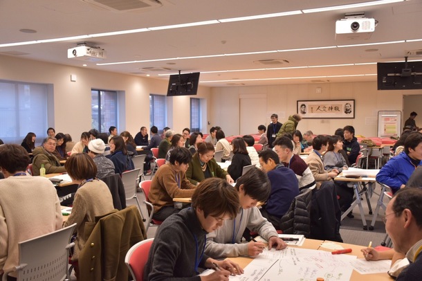 最後はその日学んだことを参加者同士で共有し合うラウンドスタディを行いました。地域や世代,立場を超えてバラバラになり,4名程度のグループを作ってその日感じたことを伝え合いました。その後,本イベントに参加していない人にも得た学びを伝えるべく,参加していない人に伝えたいことを各自で記したメッセージカードを参加者全員に配布いたしました。