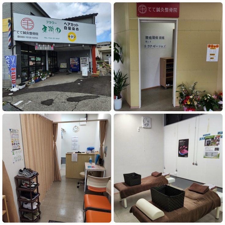 (新店舗外観(左上)・新店舗入口(右上)・新店舗受付前(左下)・新店舗施術室(右下))