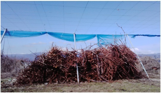 剪定した枝が地面やぶどう棚の上にあるので、bさんcさんに集めて縛ってもらう。紐で縛るのは難しいので職員がやる。