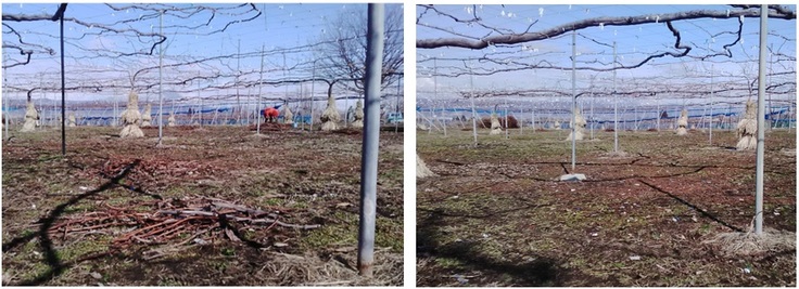休憩後は全員で枝集めと枝運び。棚の上に取り残しの枝がないか、職員が見て回る。人数が多いと作業が早いので横山は剪定を急ぐ。