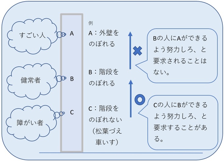 上の図のように、階段を登れる人は壁を上る努力を要求されません。社会のインフラがそのように整備され、階段はあるからです。
