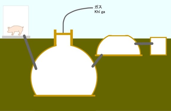 発生したバイオガスは、食事や豚のえさの調理、ガス灯に利用します。