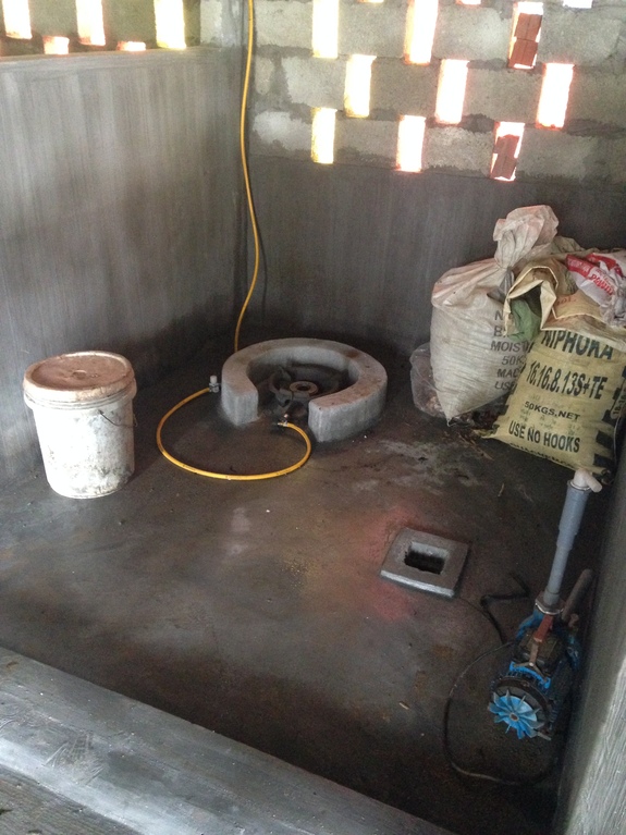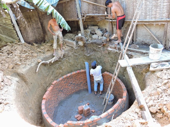 レンガを積み重ねて、外側をコンクリートで塗り固めて作る発酵槽は、大人の男性が4,5人入れる大きさ(9立米)のサイズ。(穴を掘るのも一苦労な大きさです)