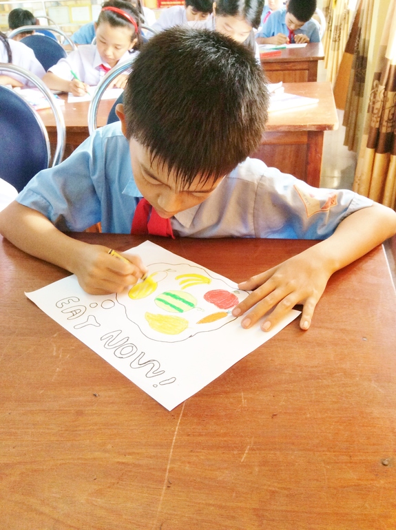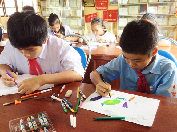 「こうかなぁ、これで良いかなぁ…」と迷いながら、キョロキョロ回りを見回しながら描く子、一心不乱に「集中!!」して手を動かす子(頭のなかで既に完成図が描かれているんでしょうね)、子どもたちが作業する様子は日本の子もベトナムの子も似ていて、思わず笑ってしまいます。