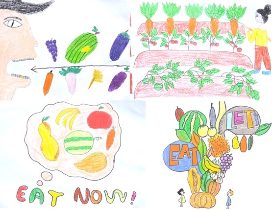 BAJ東京事務所では左上の人がお野菜をがぶーっと食べる様子の絵が「個性的でいいね!」と好評でした。右下のデザインは、中学生とは思えない完成度!!