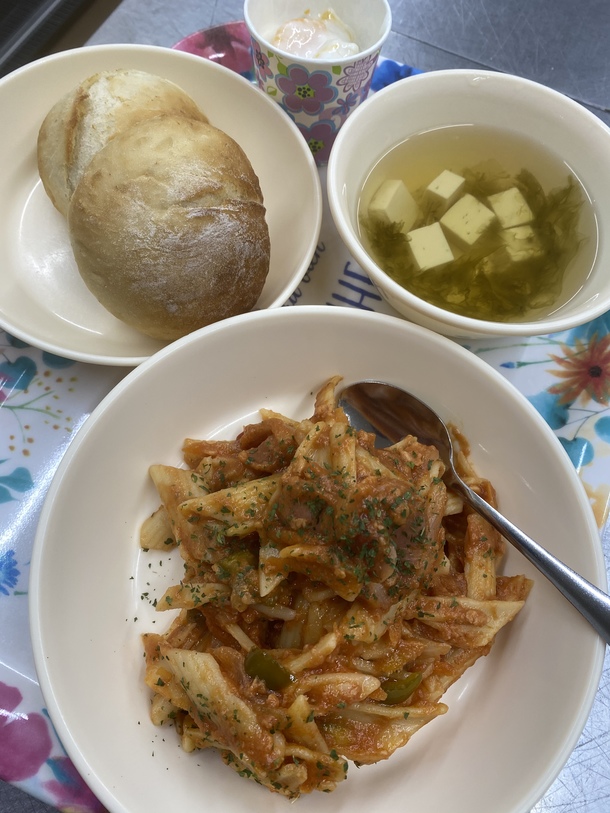 今日はペンネとパンとすまし汁とフルーツヨーグルト