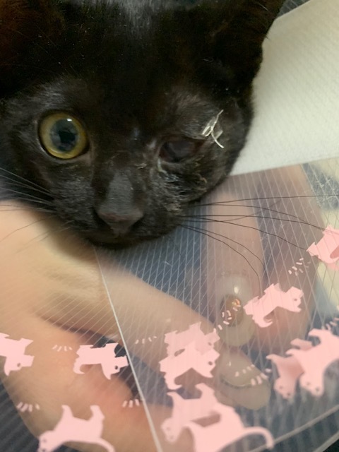 傷がある部分の瞼を縫合して保護した状態になってます。