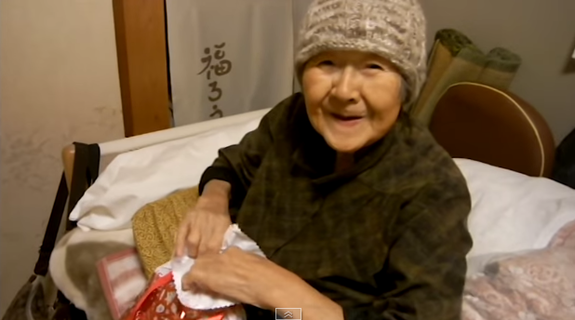 (宝石の糸で編みこんだ腹巻きをして喘息の症状が軽減されたおばあちゃん)