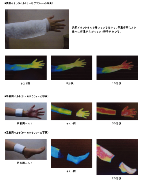 各公的機関の依頼試験調査データーを得ています。(和歌山健康センター、京都工芸繊維大学、(財)日本化学繊維検査協会等。血流促進効果・温熱効果サーモグラフィー測定結果で実証済)