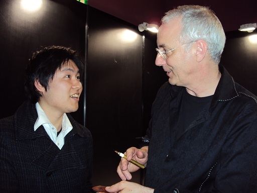 インレイ作品を見ていただいた時の写真(左:木谷 右:ポール氏))