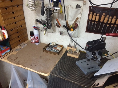 私の作業場は工房と呼べるほどのものではなく、自室の1畳程のクローゼットの中で製作しています。社会人の傍ら製作を活動をしている為、一日時間が取れても30分~1時間程度の製作時間ですが、深夜と早朝の時間帯に少しずつ製作活動をしています。