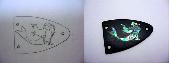 日本で知られている古来からの装飾技法である、伝統的な「螺鈿(らでん)」と、インレイの大きな違いは、扱う材を別の素材に埋め込むかどうかです。螺鈿は通常は薄い貝を使い、表現したい形に切り出した後、ベースの素材に貼り付けますが、インレイは主に厚い貝を切出し、素材に彫り込みをし埋め込みます。